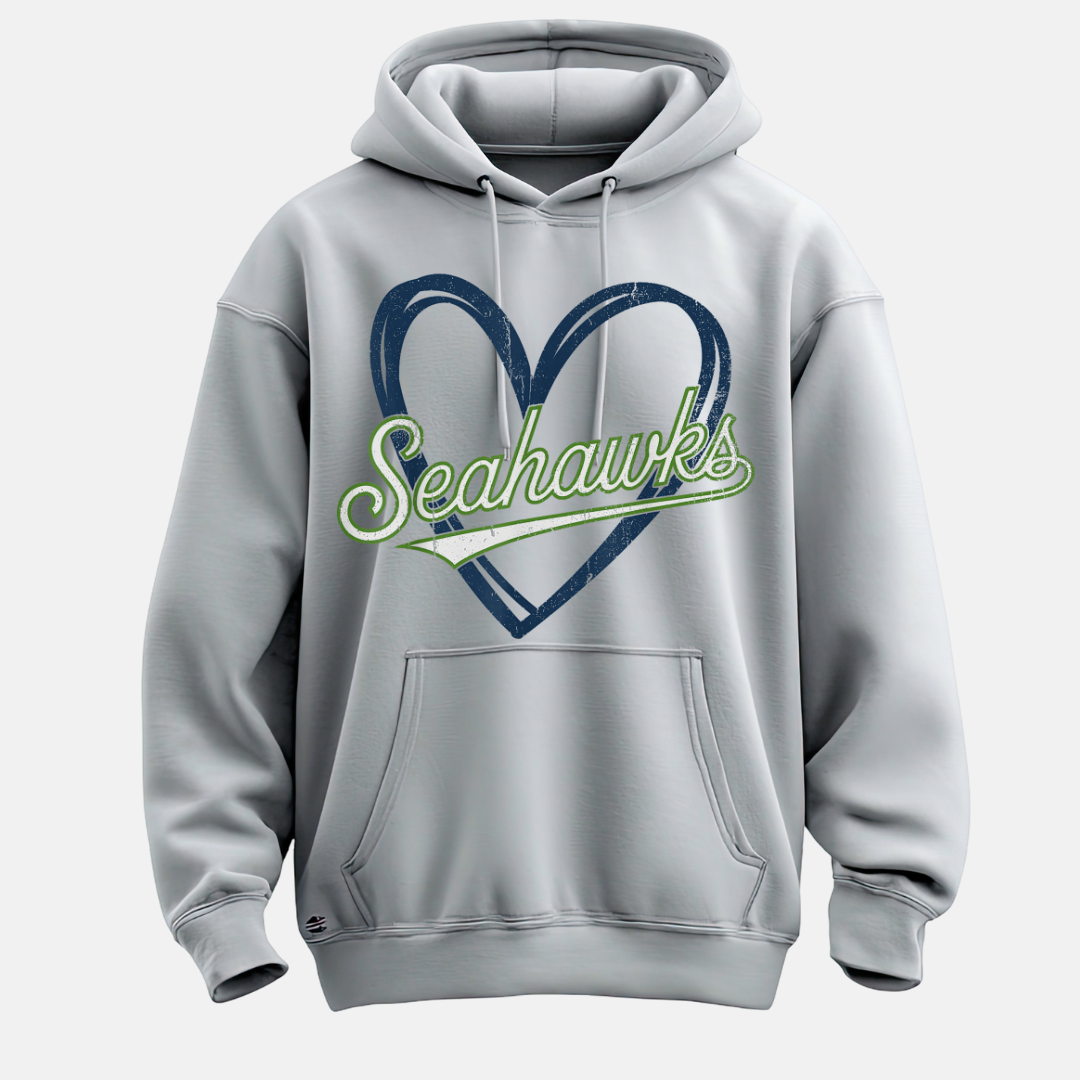 Make a bold statement with the Seahawks Heart Hoodie—your go-to for chilly game days and everyday comfort. Featuring a kangaroo pocket, drawstring hood, and the iconic heart design, this hoodie blends warmth with team pride. Available in Black, Grey, and White.