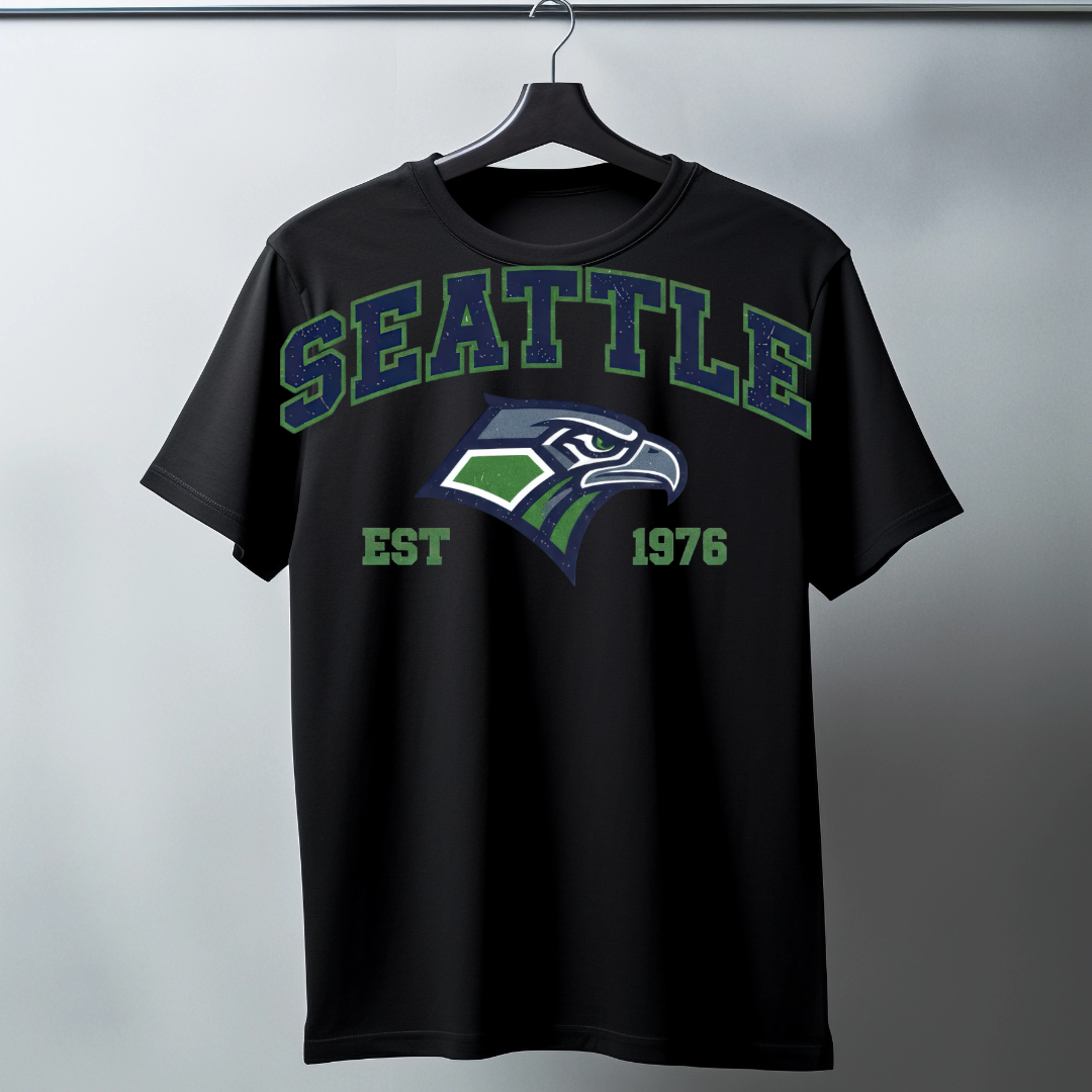 Celebrate the roots of Seahawks history with our 1976 Retro Logo Collection. Featuring bold “SEATTLE” lettering, the iconic hawk head logo, and the establishment year proudly displayed, this design pays tribute to the team’s founding era. Perfect for fans who love vintage style with modern comfort.